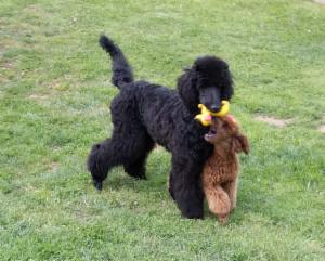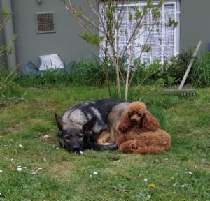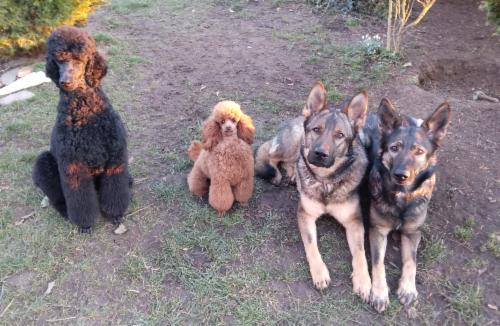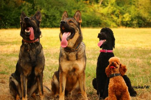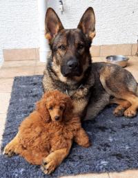 Unsere Pudel leben mit unseren beiden Schäferhunden X-Man und Ilse zusammen im Haus und auf der Couch. Unsere Schäferhunde sind die besten Freunde von unseren Pudeldamen. Sie haben unsere Ginger mit voller Energie bei der Aufzucht ihrer Welpen unterstützt.